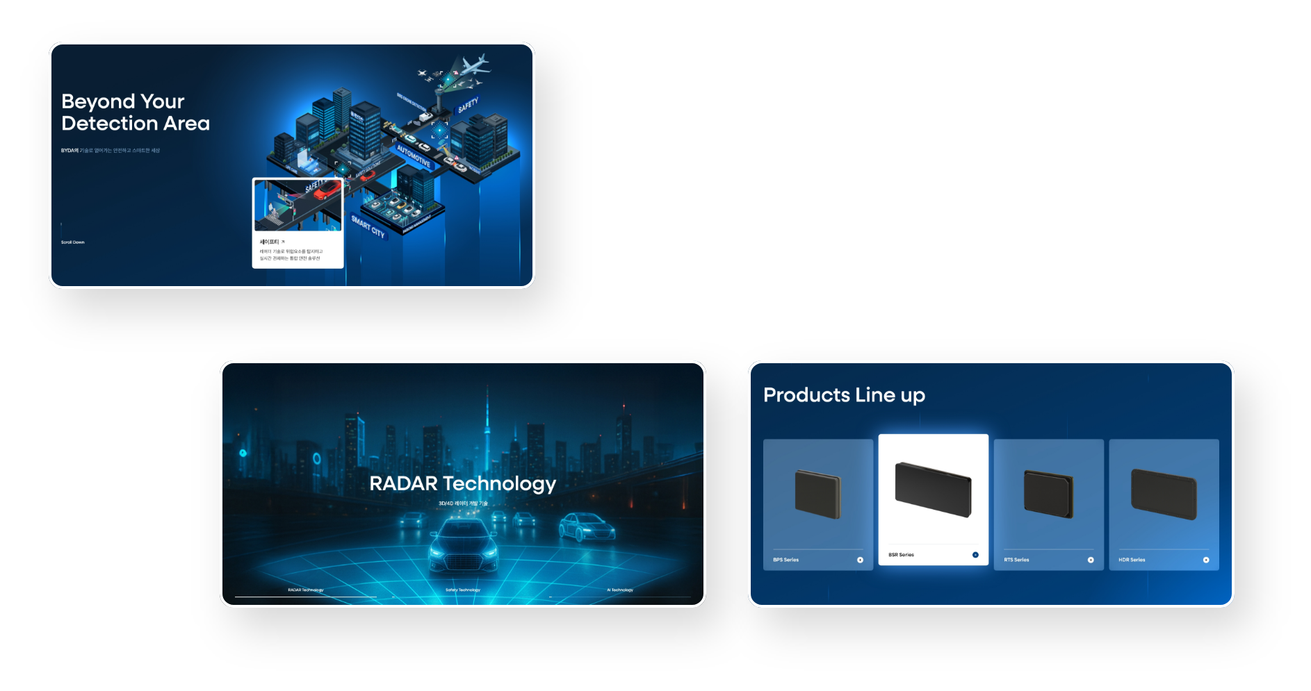 첨단, 스마트 시티의 느낌을 주고자 다크 네이비 컬러에 스카이 블루 컬러를 포인트 컬러로 활용하였습니다.